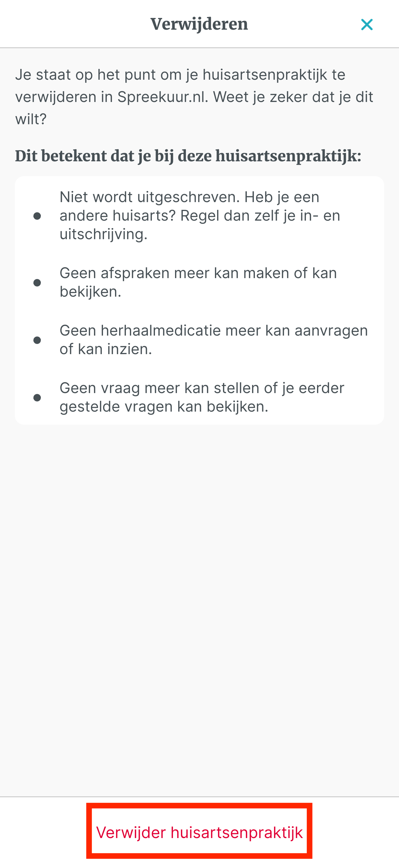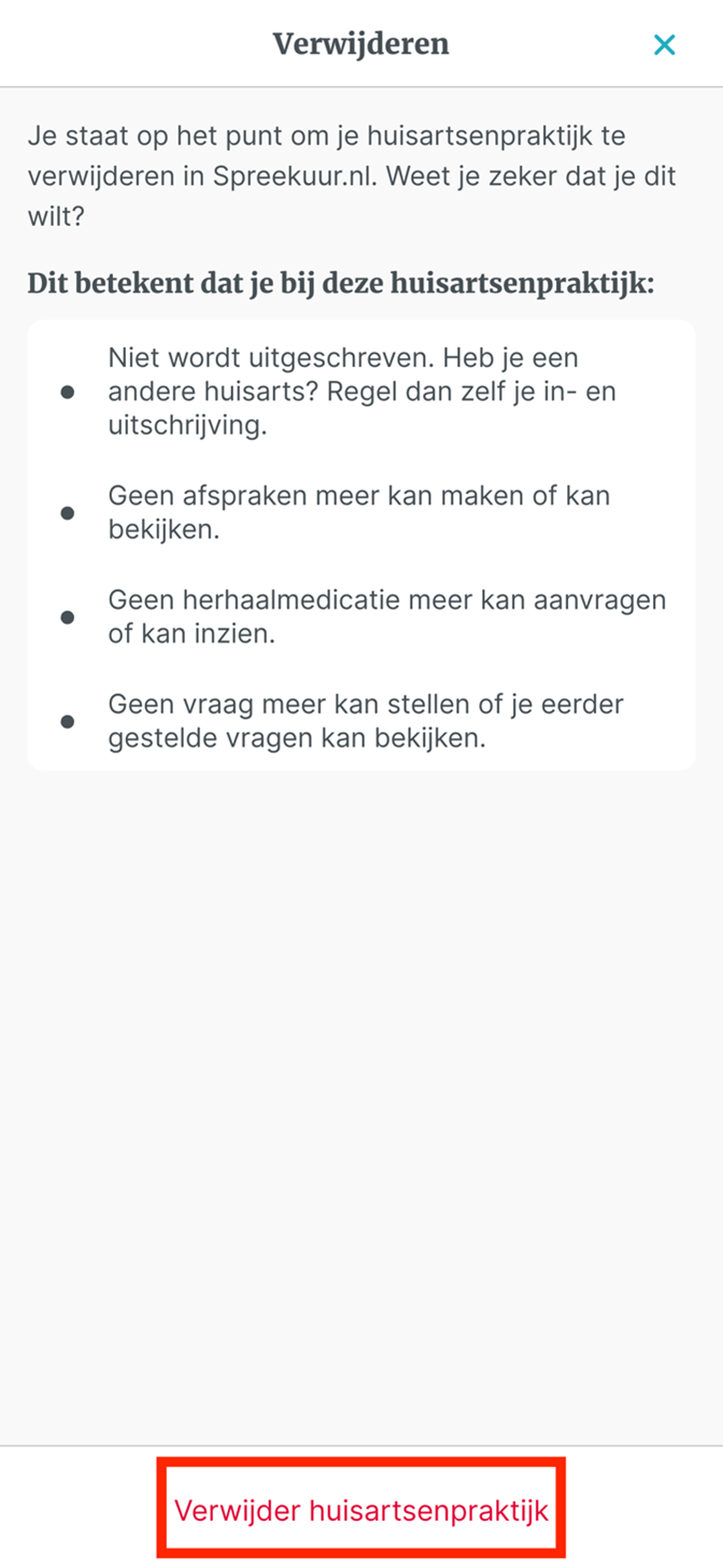 Stap 5: Lees de disclaimer en klik vervolgens op de knop 'Verwijder huisartsenpraktijk'. Jouw gekoppelde huisartsenpraktijk is nu verwijderd