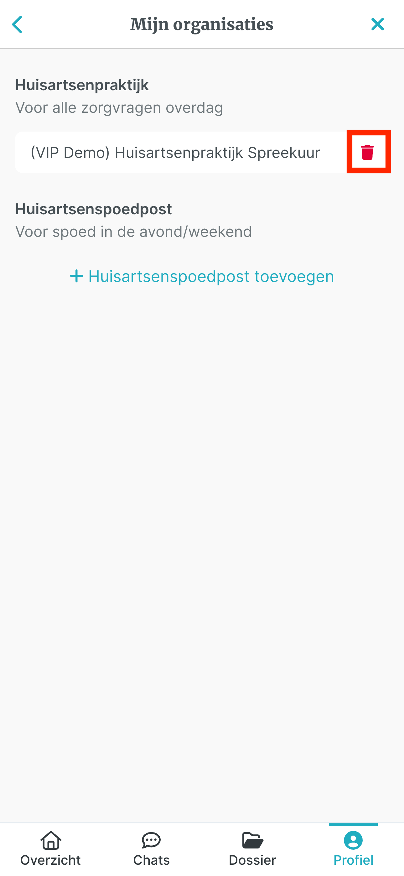 Stap 4: Selecteer het rode prullenbakje naast de organisatie die je wilt verwijderen