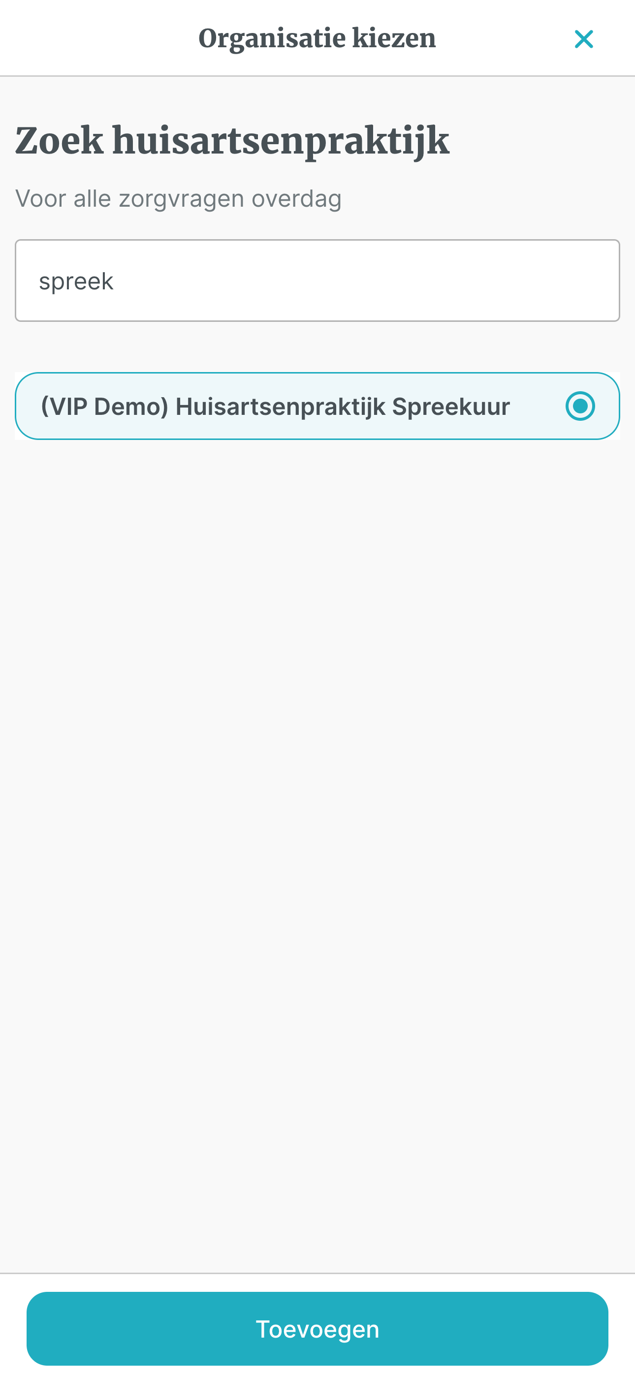 Stap 7: Zoek je huisartsenpraktijk, selecteer vervolgens de juiste praktijk en klik op de knop 'Toevoegen'.